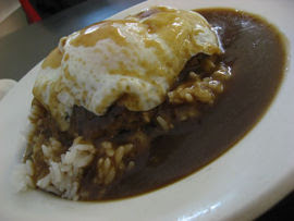 Also consider checking out a few plate lunch places. These are small, local restaurants where you can get a large meat choice, plus rice and mac salad or vegetable for under $8 or so. Sometimes the portions are big enough to serve two people. I suggest trying a loco moco (hamburger patty, egg, and gravy over rice, see photo) or the teriyaki beef or kalbi beef. Yum.