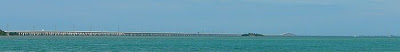 The current Seven Mile Bridge (see photo), one of the most famous bridges in the world, finished construction in 1982. It connects Knight’s Key in the Middle Keys to Little Duck Key in the Lower Keys, and is actually just shy of 7 miles at 6.79 miles long. On a Saturday in April the annual Seven Mile Bridge Run, with over 1500 participants, closes the bridge for 2 ½ hours. This “fun run” is held in commemoration of the rebuilding of the bridge. The photo shows the full span of the Seven Mile Bridge as seen from the east shore of Ohio Key. The arc over Moser Channel can be seen to the right and Knight’s Key can be seen to the extreme right.