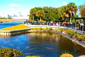 Manatee Park (see photo) is a 17-acre park that allows for viewing of manatees from November through March. This is when the temperatures of the Gulf of Mexico and the rivers drop below 68F degrees, and the endangered manatees seek refuge from the cold waters by swimming into the Florida Power and Light’s warm-water discharge canal. This area creates a non-captive sanctuary that provides a winter haven for the warm-blooded manatees.