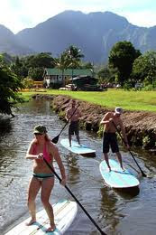 Are you up for stand-up paddle boarding? All of Hawaii is well-known as an outdoor paradise for getting exercise. Everything is available from surfing to biking down the slope of a volcano. And now there’s stand-up paddle boarding – a sport and exercise phenomenon that is growing exponentially. You get upper arm workout when you paddle, as well as strengthening those abs as you try to balance and stay on the board. While Hanalei Bay can have strong surf swells much of the year, during the summer from May through August it’s flat – perfect for beginning paddle boarding.