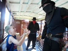 My favorite train is called the “Grand Sierra Scenic Railroad.” It’s a real steam train and so fun to ride. It chugs you all around the park. But, you have to be careful because you might be riding when robbers get on board and they try to get your money. That happened to me!