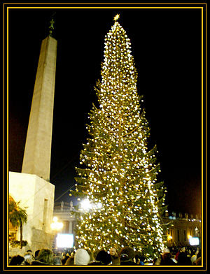 - Rome. The tradition of placing a Christmas Tree in the Saint Peter’s Squarestarted in 1982 during the pontificate of Pope John Paul II,[1] when the Polish-born Pope introduced the northern European symbol of Christmas spirit. Interestingly up until that time there had been no tradition of a Christmas tree at the Vatican. Now each year the Vatican accepts a tree donated by a different European country or region. In addition to the tree, St. Peter’s Square hosts a larger-than-life nativity scene in front of the obelisk. The nativity scene has seventeen life-size statues. wikipedia.org Check out Italy timeshare rentals.