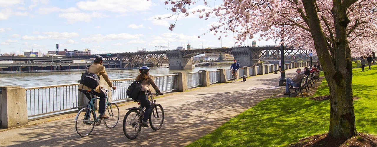 1. Portland, OR: Portland is well-connected by pathways for cyclists. The city offers on and off road trails, designated street lanes, and a healthy local bike culture. The beautiful riverfront path offers gorgeous water views. Hop on at Waterfront Park (pictured) via the Steel Bridge and enjoy a quick 3-mile loop. Insider tip: Kids love to splash at the Salmon Street Springs Fountain in Waterfront Park too.