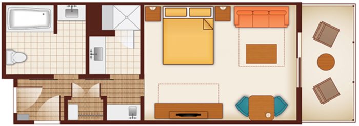 DVC studio rentals are not your typical studio room. They are typically equipped with a small kitchenette, a large bathroom, and often a balcony. Many of these studios are even designed with creative elements like pullout couches so they can sleep up to 6 people!