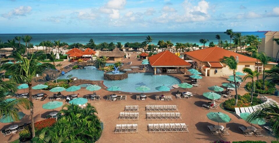 La Cabana Beach Resort & Casino on Eagle Beach offers all the amenities you need for unforgettable Aruba vacations. The resort features a wide range of water recreation including parasailing, snorkeling, jet-skiing, and deep sea fishing, plus a swimming pool with waterslide, fitness center, spa, casino, and supervised children's day camp. Professional beach services provide lounge seating, umbrellas, towel service, and beachside dining, while the resort concierge arranges exciting excursions including golf, scuba diving, and sunset sailing adventures.
