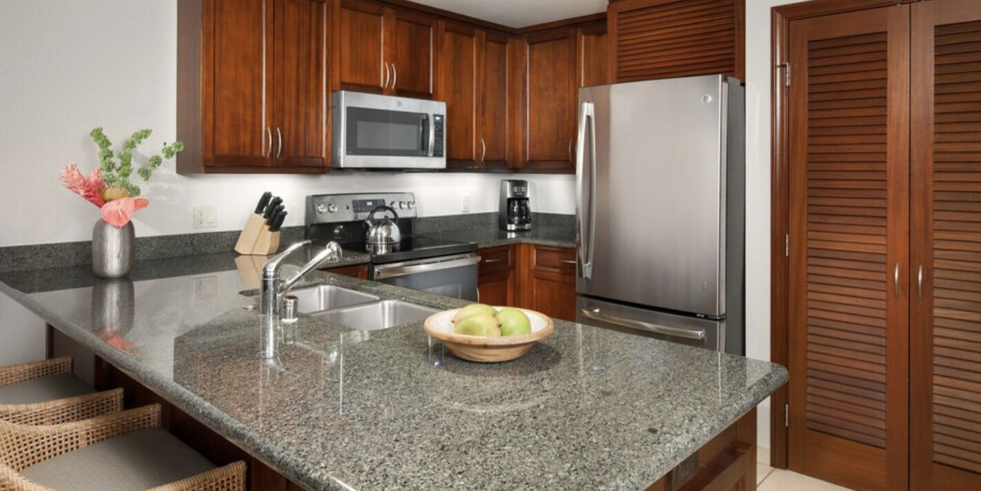 The Lahaina Tower at Marriott's Maui Ocean Club features spacious one, two, and three-bedroom suites designed with contemporary Hawaiian elegance. Each unit offers a fully equipped kitchenette or kitchen with granite countertops, and private lanais showcasing spectacular ocean, island and garden views. Villas also include roomy living and dining areas to offer additional space to unwind. Modern amenities include plush bedding with premium linens, oversized soaking tubs in master bathrooms, flat-screen TVs with premium cable, complimentary high-speed Wi-Fi, and in-suite washers and dryers.