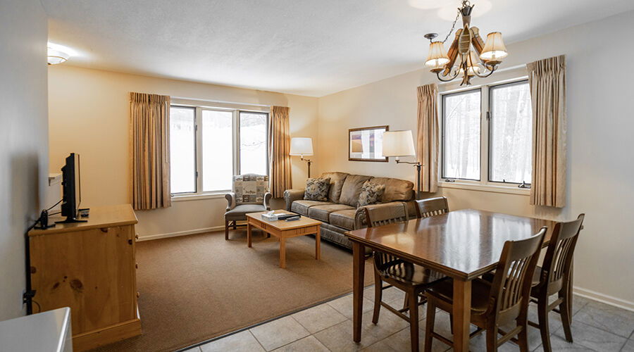 All of the rooms at Telemark are set in either the secluded woods, overlooking Mount Telemark or along the shores of Lake Namekagon. Studios, one-bedroom units and two-bedroom units are available, suited for two to six individuals depending on unit size. Depending on the exact unit in questions, many come outfitted with luxuries like full kitchens, fireplaces, washer/dryers, private porches and jetted whirlpool bathtubs.
