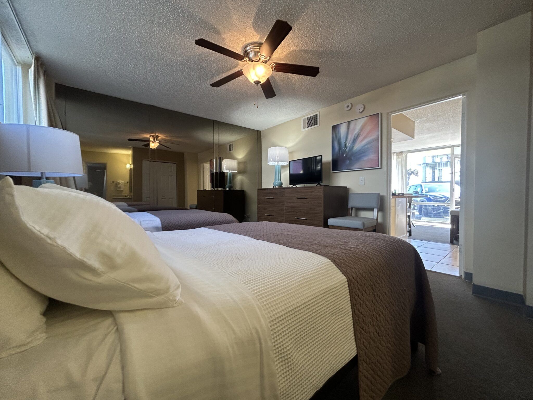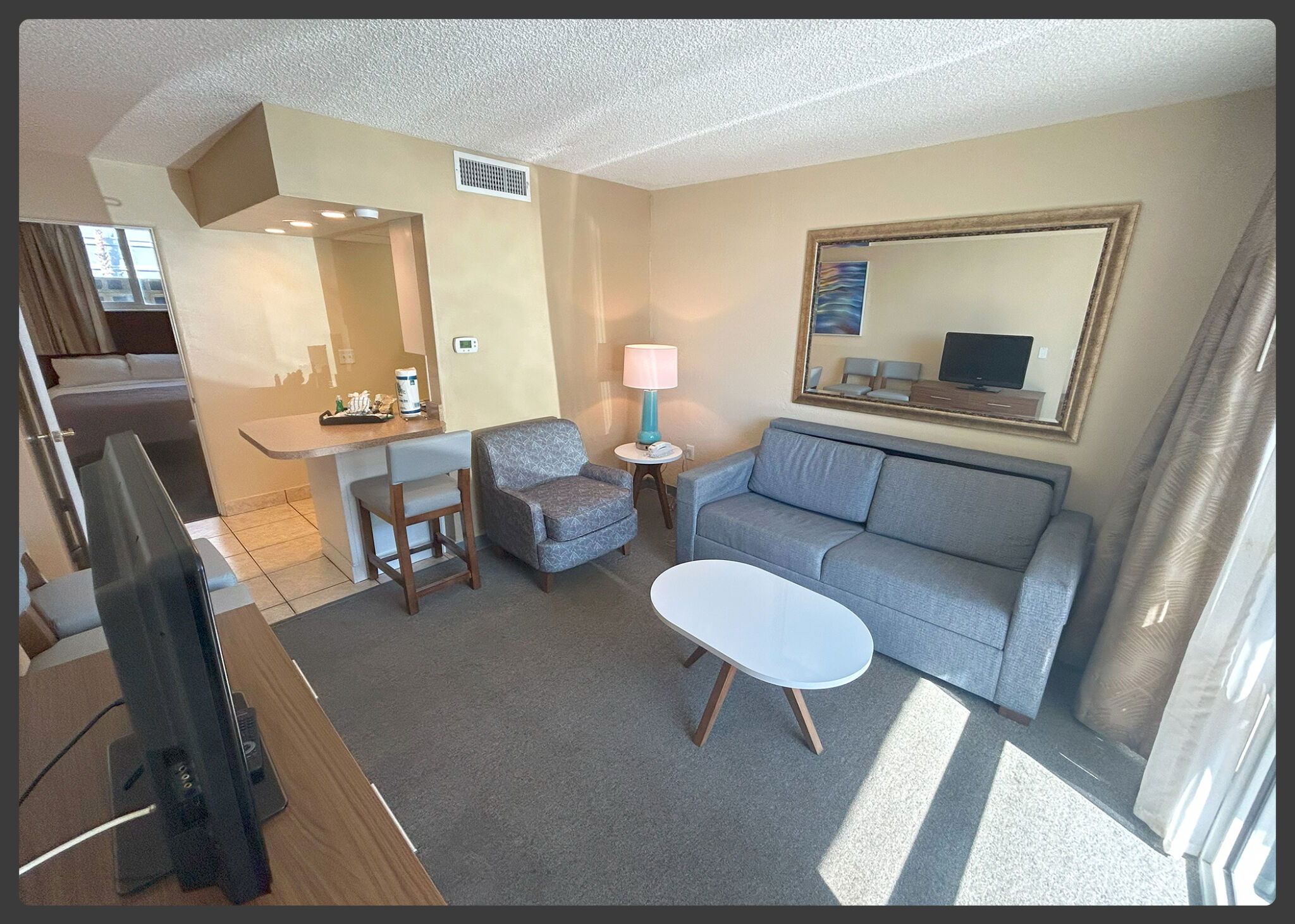 Every room at Outrigger Beach Club boasts an amazing view of the Atlantic Ocean due to the resort's boomerang layout . The Outrigger offers studio, efficiency, and one-bedroom timeshare accommodations. Studio units sleep two and offer a queen sleeper sofa. Efficiency units sleep four and feature a queen Murphy bed and full-size sleeper sofa. One-bedroom units sleep six and feature two full-size beds and a queen sleeper sofa. All timeshare units are equipped with a kitchen that includes a refrigerator, stove top, convection microwave oven and coffee maker.