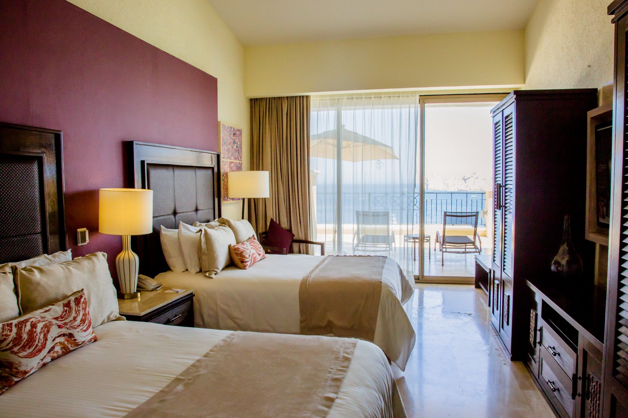All of the suites at Casa Dorada are inspired by the stark grandeur of the desert - pale earth tones and sleek lines. Suite sizes range from one to three bedrooms, with the one-bedroom Junior suites including the essentials like a master bedroom, kitchenette, separate living area, flatscreen plasma TV's, Wi-Fi access and oceanview terrace. Two bedrooms come with a bit more - full kitchen, separated living and dining areas and Jacuzzi tubs. The exquisite three-bedroom suites include everything offered by the two-bedroom as well as vaunted, high ceilings, fine woods, marble bathrooms and sprawling terraces with breathtaking ocean views.