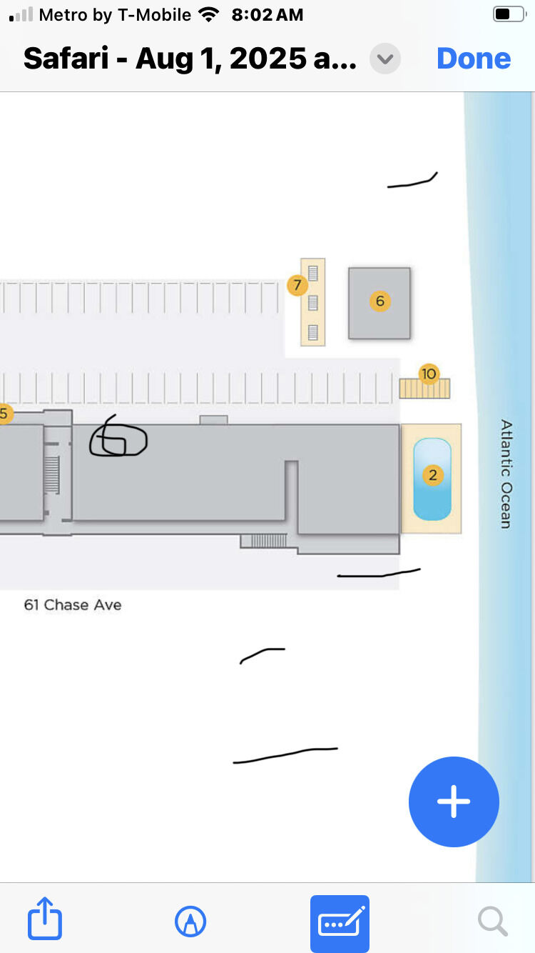 Beach side. No patio seconds to pool and beach. Need beach chairs. Beach towels come with the unit. Walk to ocean house. Gift shop across the street. Jetty down the beach. Nice for fishing. Better pictures on the web sight.