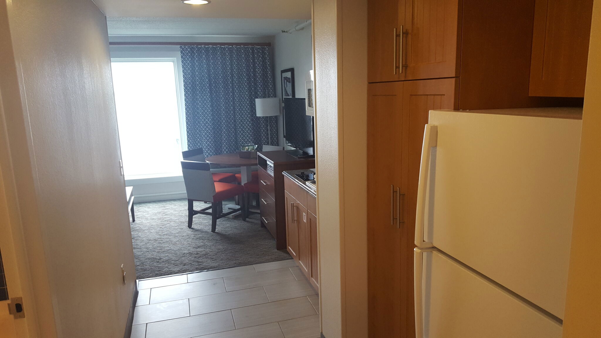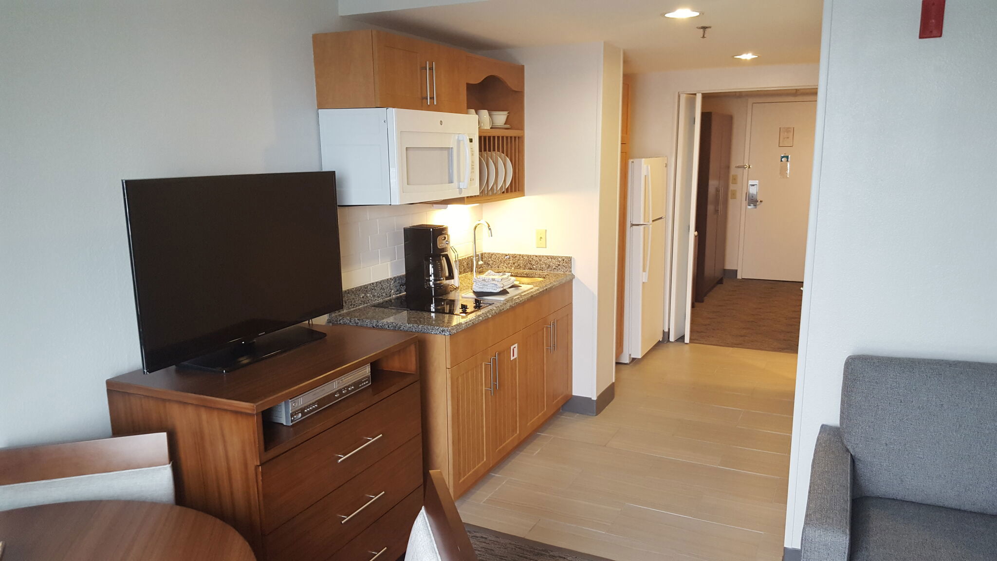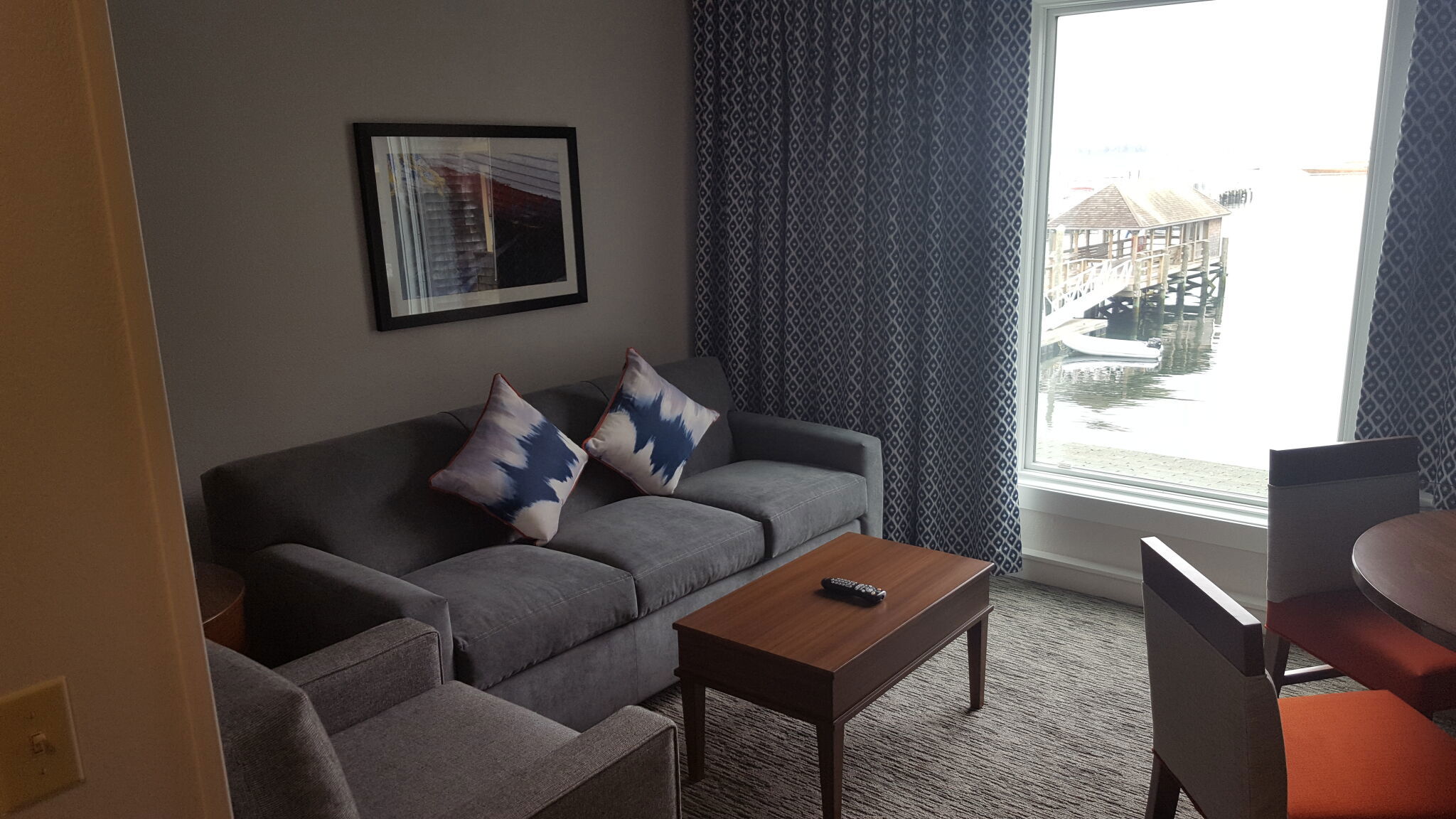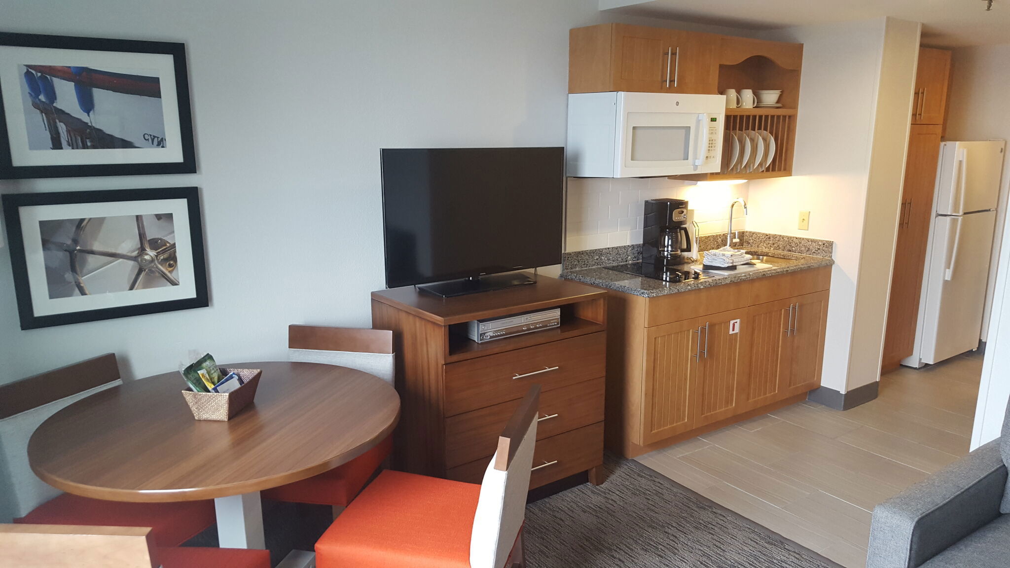 The suites are one-bedroom condos designed to feel like a comfortable home by the water. Each one has a queen bed in a private bedroom, a queen sleeper sofa in the living area, and a kitchenette outfitted with refrigerator, microwave, dishwasher, coffee & tea maker, toaster, and flatware. Some older units also include a cooktop. A dining area, flat-screen TV, DVD player, and free Wi-Fi round out the essentials. Some top-tier deluxe suites offer harbor or city views. The space ranges from about 480 to 600 square feet and accommodates up to four guests.