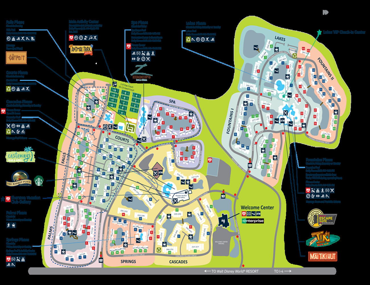 Sheraton Vistana Resort offers guests 135 tranquil acres of lush tropical landscaping, fountains, lakes and waterfalls that feel a world away from the crowds of Orlando. But that's just the beginning - Sheraton Vistana also boasts seven outdoor swimming pools, eight outdoor whirlpools, three game rooms, four children's playgrounds, a full sixteen-hole minigolf course and thirteen lighted tennis courts that guarantee family and friends will never be bored for even a moment.