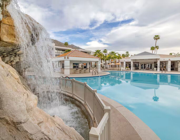 Discover the ultimate oasis in Palm Springs! Surrounded by tropical landscaping and a serene atmosphere, Palm Canyon Resort and Spa truly feels like a lush haven among the desert. The 1.5 acre pool and sundeck are surrounded by dramatic rock formations and cascading waterfalls, feeling like a hidden grotto. An in-cave whirlpool hot tub can also be found, and a water slide weaves among the rocks. In addition, guests are invited to take advantage of the game room, fitness center, and indoor basketball and volleyball courts. And of course, the onsite Canyon Spa offers a host of services including a variety of massage treatments, facials, manicures, pedicures, body scrubs, and wraps.