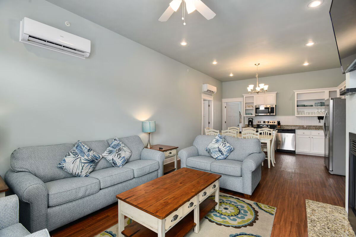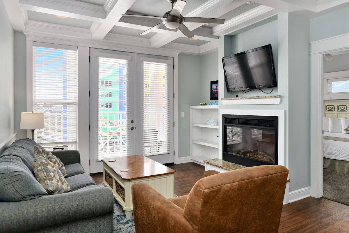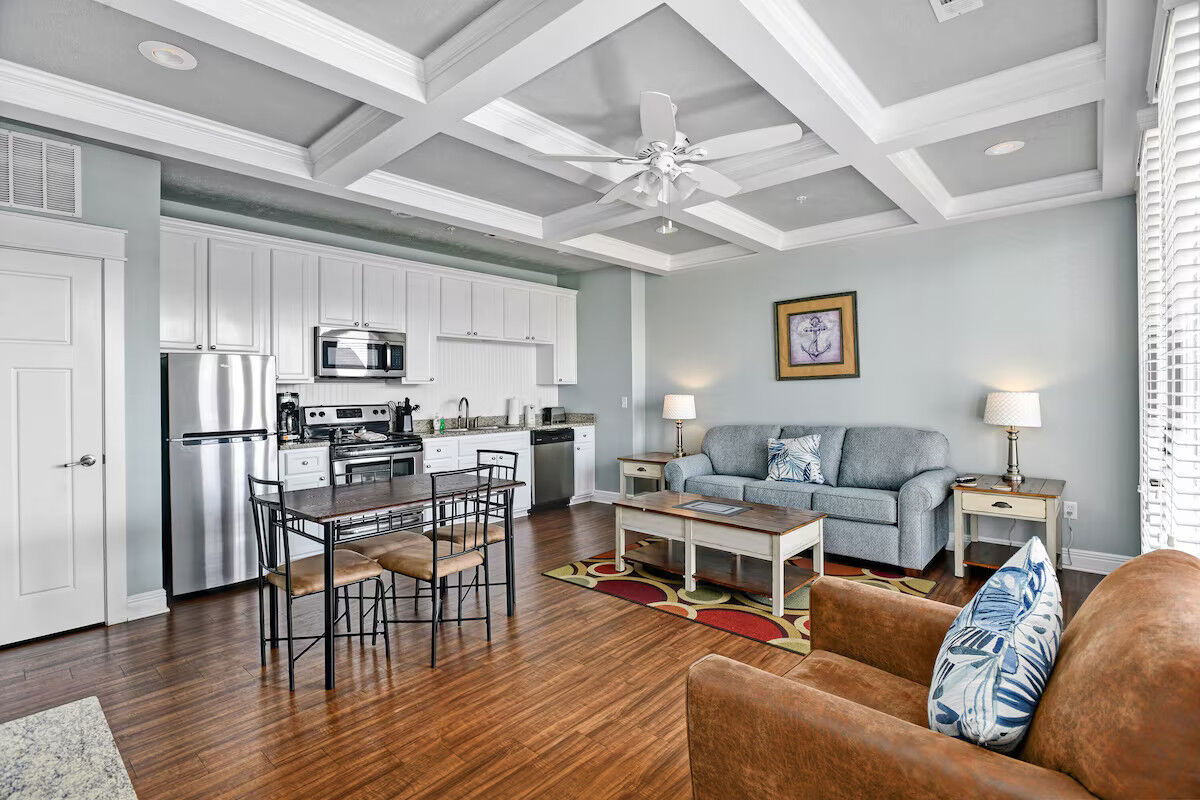 Accommodations range from studios to spacious three-bedroom villas, each equipped for comfortable extended stays. Units include fully-equipped kitchens, in-unit washer/dryer (in many layouts), electric fireplaces, private balconies or decks, HD flat-screen televisions, and free Wi-Fi. The décor blends rich wood tones and cozy textures with subtle nautical touches, creating a home-away-from-home atmosphere whether you’re staying for a weekend or longer.