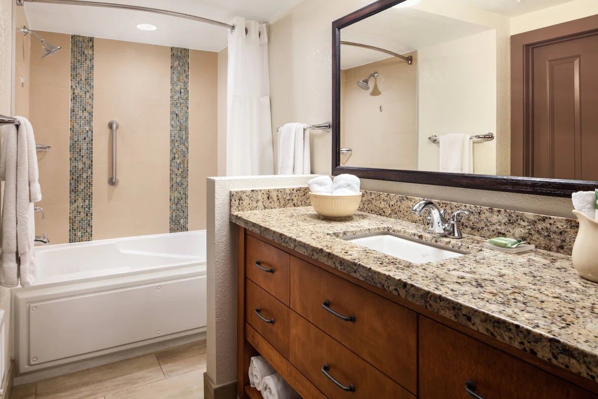 After a day of fun and thrills, return to your comfortable studio or villa. Enjoy all the conveniences of home, including living and dining areas, plus a fully equipped kitchen! All rooms also include a television with cable/satellite programming, DVD player in living area, whirlpool tub in select studios and all one- bedroom villas, fully furnished private balconies and porches and complimentary Wi-Fi access.