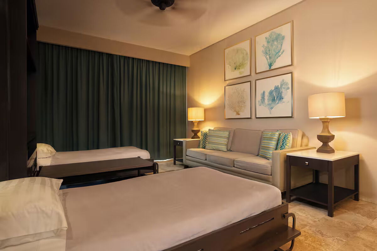 The Royal Sands features over 300 elegantly appointed villa-style accommodations, ranging from master suites to spacious two-bedroom villas that comfortably sleep up to six guests. Each contemporary unit showcases Mexican-inspired design elements with upscale furnishings and comes equipped with fully-stocked kitchenettes or kitchens, separate dining areas, and private terraces overlooking the Caribbean's turquoise waters or lush tropical gardens. Modern conveniences include marble bathrooms with jetted tubs, flat-panel TVs with international programming, complimentary high-speed Wi-Fi, and twice-daily housekeeping service.