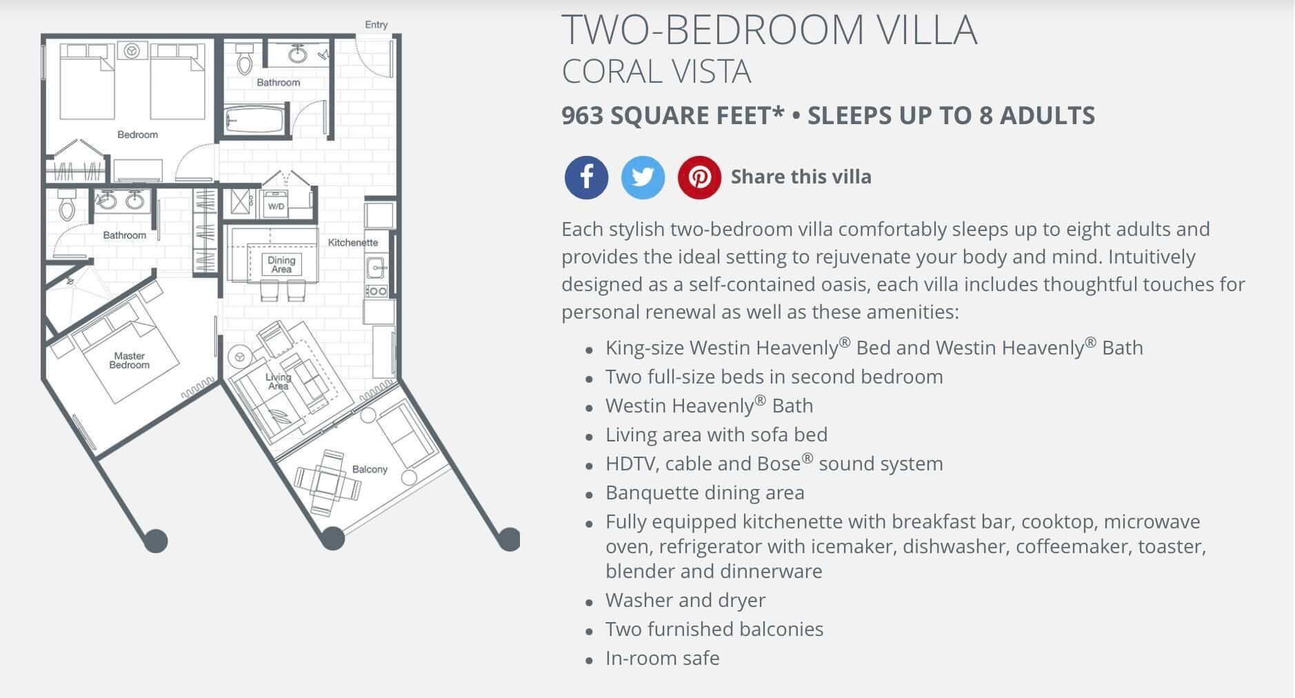 The rooms at the Coral Vista Villas have all been recently renovated and are decked out with fresh, modern furnishings. Units are equipped with classic Westin essentials; Westin Heavenly Beds and Westin Heavenly Baths. Add to that flat- panel televisions, Bose entertainment systems, fully furnished balconies, in- room washer and dryer and a fully equipped kitchenette and you've got everything you need to feel right at home. Units at the Coral Vista Villas include studios, two-bedroom villas, two-bedroom lofts and three-bedroom lockoff villas.