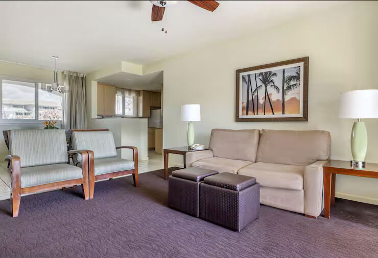 The Point at Poipu features lovely one-bedroom and two-bedroom timeshare accommodations with all the comforts and conveniences of home. Master bedrooms feature a king-size bed and large bathroom with separate soaking tub and shower stall. Kitchens are fully equipped with granite counter tops, range and oven, microwave, refrigerator, dishwasher, utensils, cookware, dishware, and dining area. Living rooms have complete entertainment centers, and private lanais open to the resort's lush gardens or the majestic span of the Pacific Ocean.