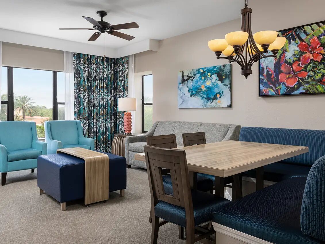 Spacious floor plans and inviting décor create the perfect home-away-from-home at River Island. With a variety of accommodations in all manner of sizes, Orange Lake Resort - River Island is perfect for everyone, be it vacationing couples or families enjoying a getaway. Relax in comfort with one-bedroom units that sleep up to four, two-bedroom units that sleep up to eight, three-bedroom units that sleep up to twelve, and four-bedroom units that sleep up to fourteen. All accommodations have pull-out sofa sleepers and come with full kitchens that include a microwave, dishwasher, and in-suite washer/dryer.