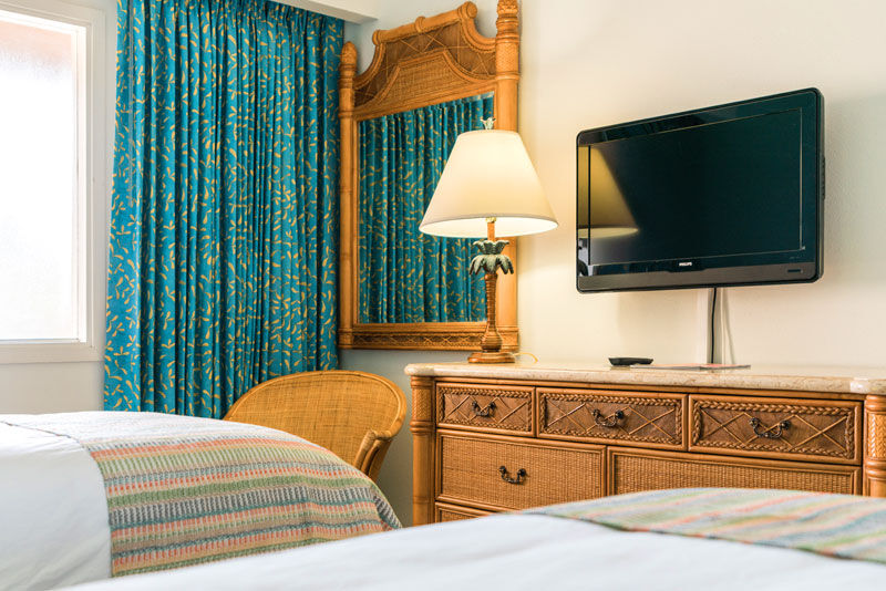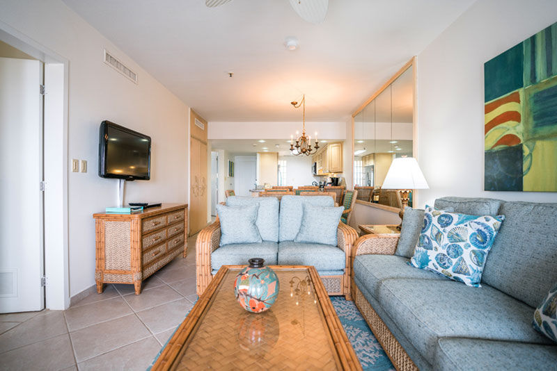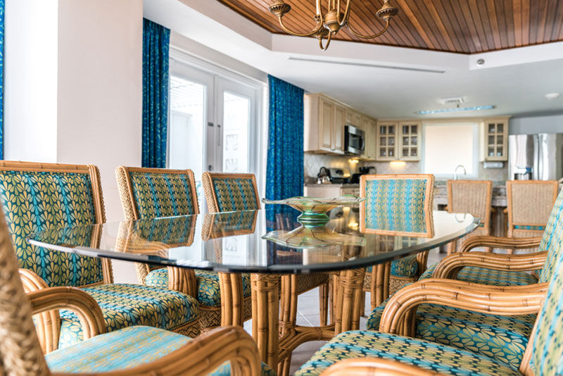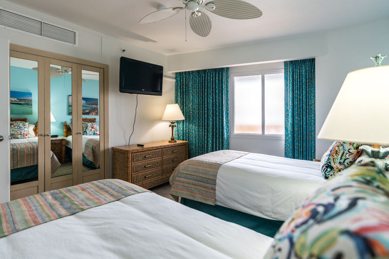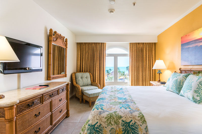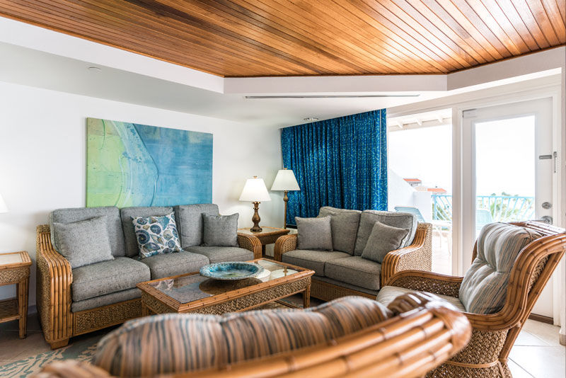 The resort's spacious accommodations feature fully-equipped two, and three-bedroom suites designed with tropical décor and modern conveniences to provide the comfort of home with luxury hotel services. Each suite includes full kitchens with granite countertops, stainless steel appliances, dishwashers, and complete cookware, while living areas feature pull-out queen sofa beds and flat-screen televisions. Private balconies with stunning sea views allow guests to wake up to breathtaking ocean vistas and enjoy the gentle Caribbean breeze from the comfort of their own suite.