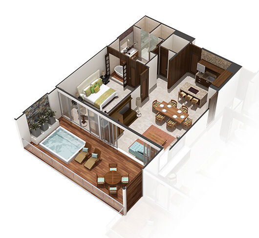 The accommodations at Grand Luxxe are spacious and designed for high comfort, offering villa-style suites across several layouts. Many units include gourmet kitchens, dining and living areas, private terraces with plunge pools, multiple bathrooms with marble finishes and Jacuzzi tubs, and sweeping views of jungle or sea. The décor blends natural materials, neutral tones, and elegant modern finishes to create a serene retreat. Recent additions such as the Jungle Suites add secluded floor plans and elevated design touches for guests seeking a more intimate feel.