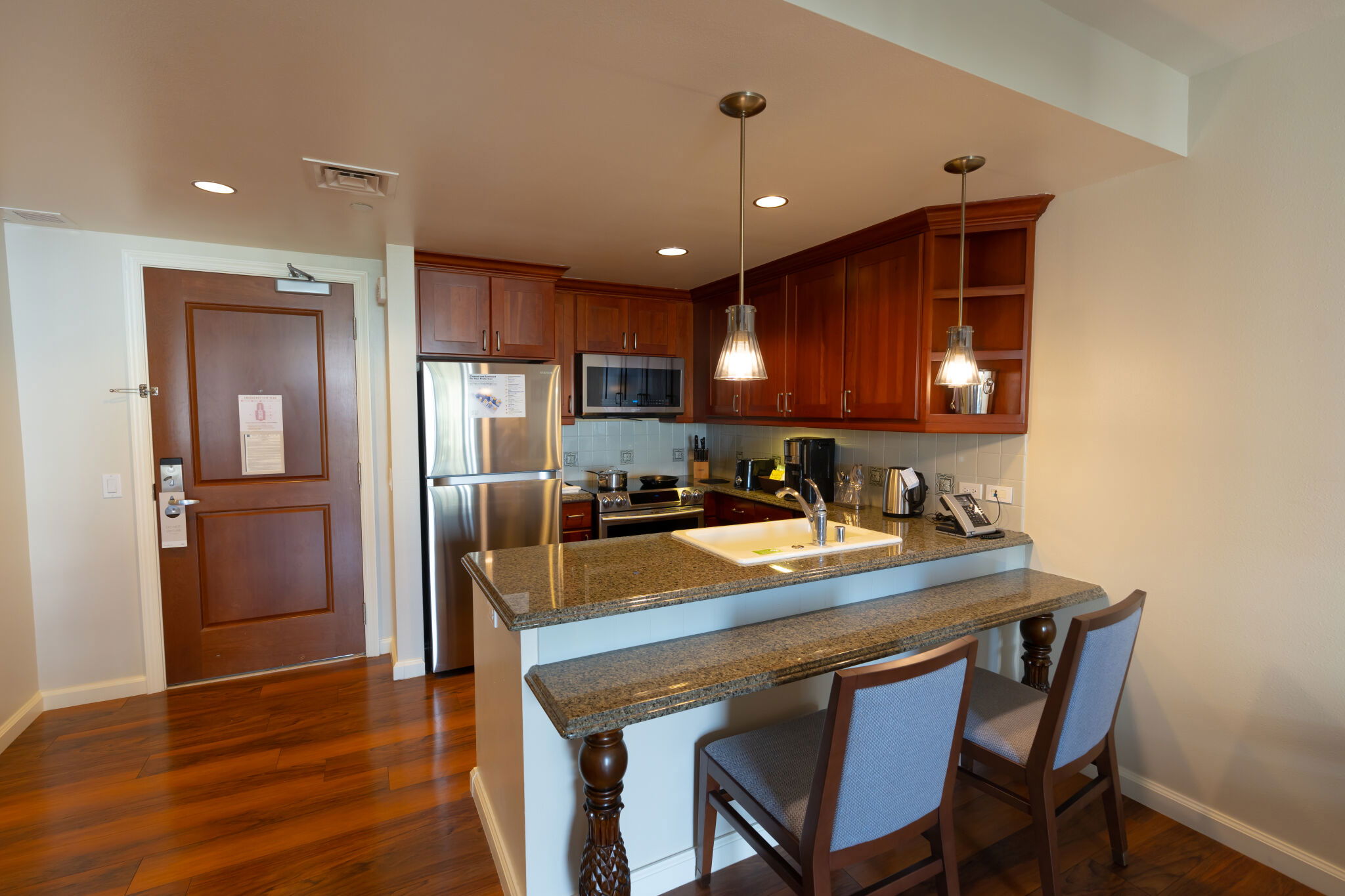 The Grand Waikikian offers beautiful accommodations easily matching and exceeding those of a premiere hotel. All of the one-bedroom, two-bedroom and three-bedroom units feature a private balcony with fantastic ocean or city views. Relax in your spacious living area, dine together as a group at the dining table and whip up meals at your convenience in the full kitchen. In-room washers and dryers make tackling laundry easy, and complimentary Wi-Fi keeps you connected.