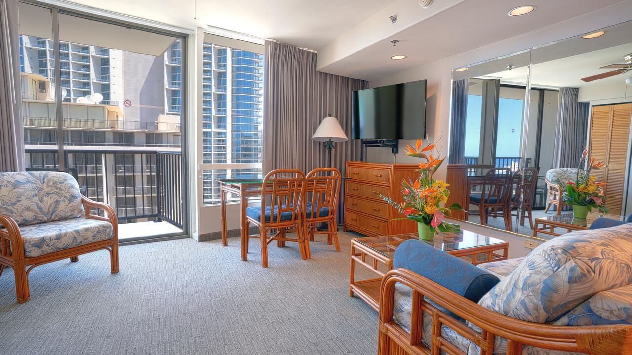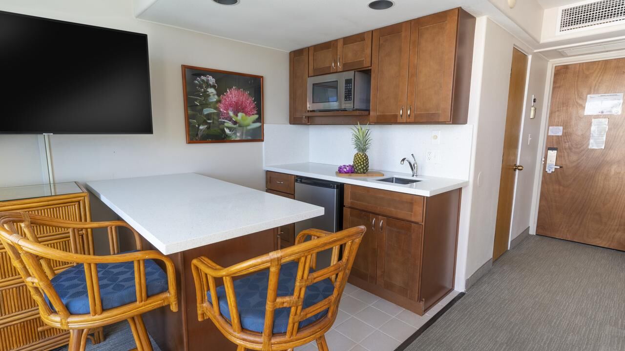 With five different suite configurations, Imperial Hawaii Vacation Club has the perfect room for your group. The resort's Ohia studio suites sleep two with a double Murphy bed and queen sleeper sofa. Studios are equipped with a mini-kitchen with coffee maker, microwave, toaster, and mini-refrigerator. The Banyan and Palm one-bedroom suites sleep four and offer a queen and double Murphy bed in the bedroom, a queen sleeper sofa in the living area, a full kitchen in the Palm suites and a mini-kitchen in the Banyan suites. Koa deluxe one-bedroom, two-bathroom suites offer a queen bed in the bedroom, a queen sleeper sofa in the living area, and a full kitchen. Hala two-bedroom, two bath suites feature a queen bed in the master bedroom, a double or single bed in the second bedroom, a queen sleeper sofa in the living area and a full kitchen.