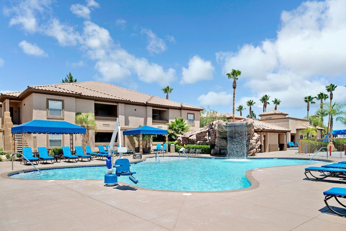 A hidden oasis located just off West Tropicana Ave., this year-round, all-suite resort has all the comforts of home you could wish for!Hilton Vacation Club Desert Retreat Las Vegas offers one- and two-bedroom timeshare accommodations complete with a fully- equipped kitchen, full-size washer and dryer, separate dining and living areas, Roman tub, spacious walk-in closet, and air conditioning. One-bedroom units sleep four with a king bed in the bedroom, and a sleeper sofa in the living area. Two-bedroom units sleep six with a king bed in the master bedroom, a queen bed in the guest room, and a sleeper sofa in the living area.