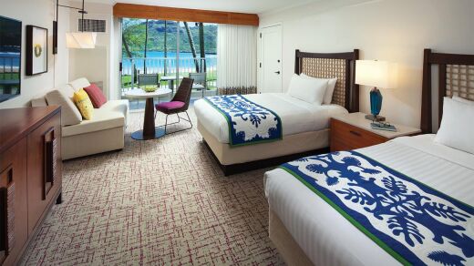 All of Marriott's Kauai Beach Club Pacific-inspired one-bedroom and two-bedroom villas feature a separate living and dining area, private lanai, and gourmet center with sink, dishwasher, refrigerator, microwave, dinnerware and stemware. Each timeshare villa offers a master suite with a king-size bed, and a queen size Murphy bed that pulls out from the wall. This configuration allows one-bedrooms to sleep up to four, and two-bedrooms to sleep up to six.