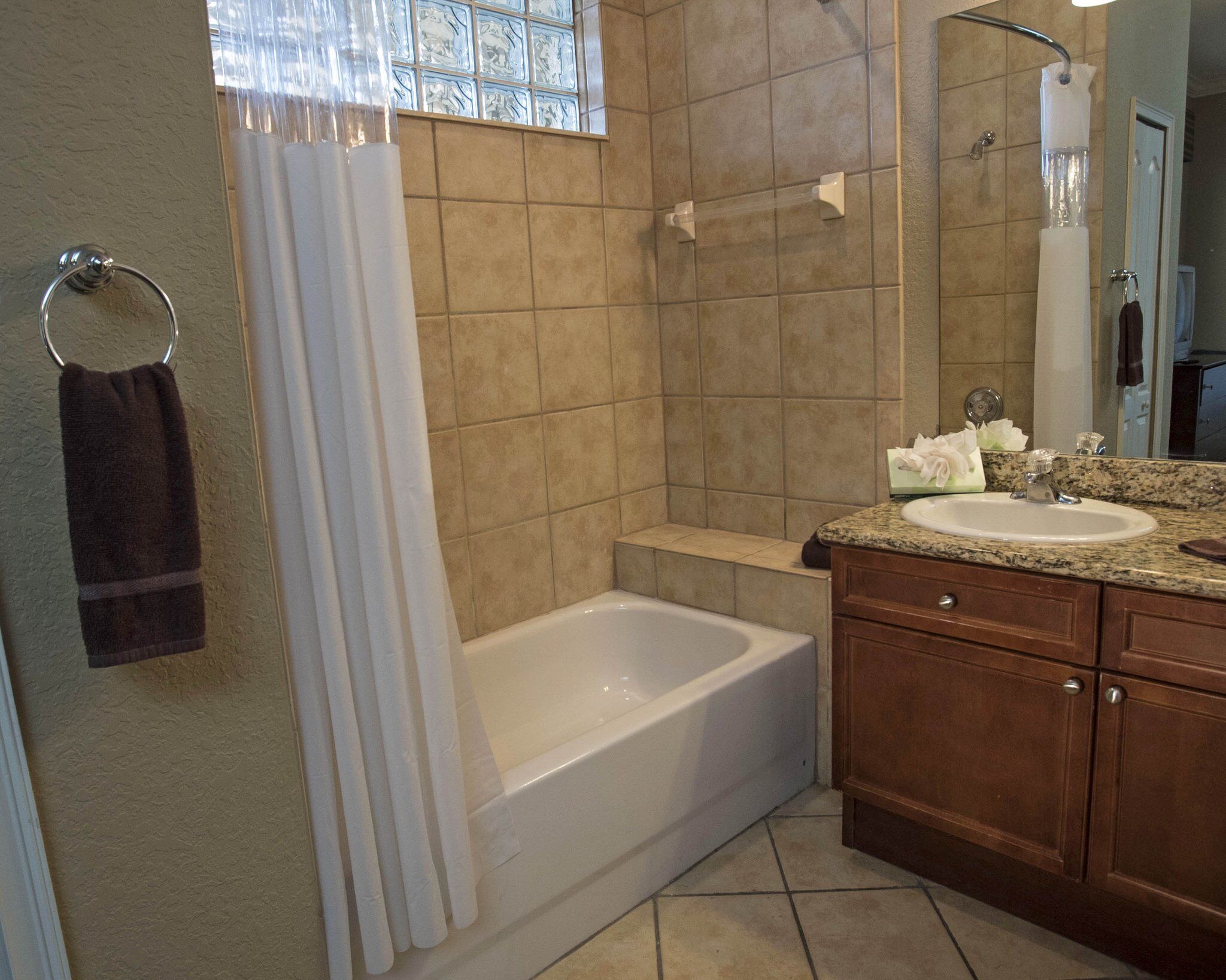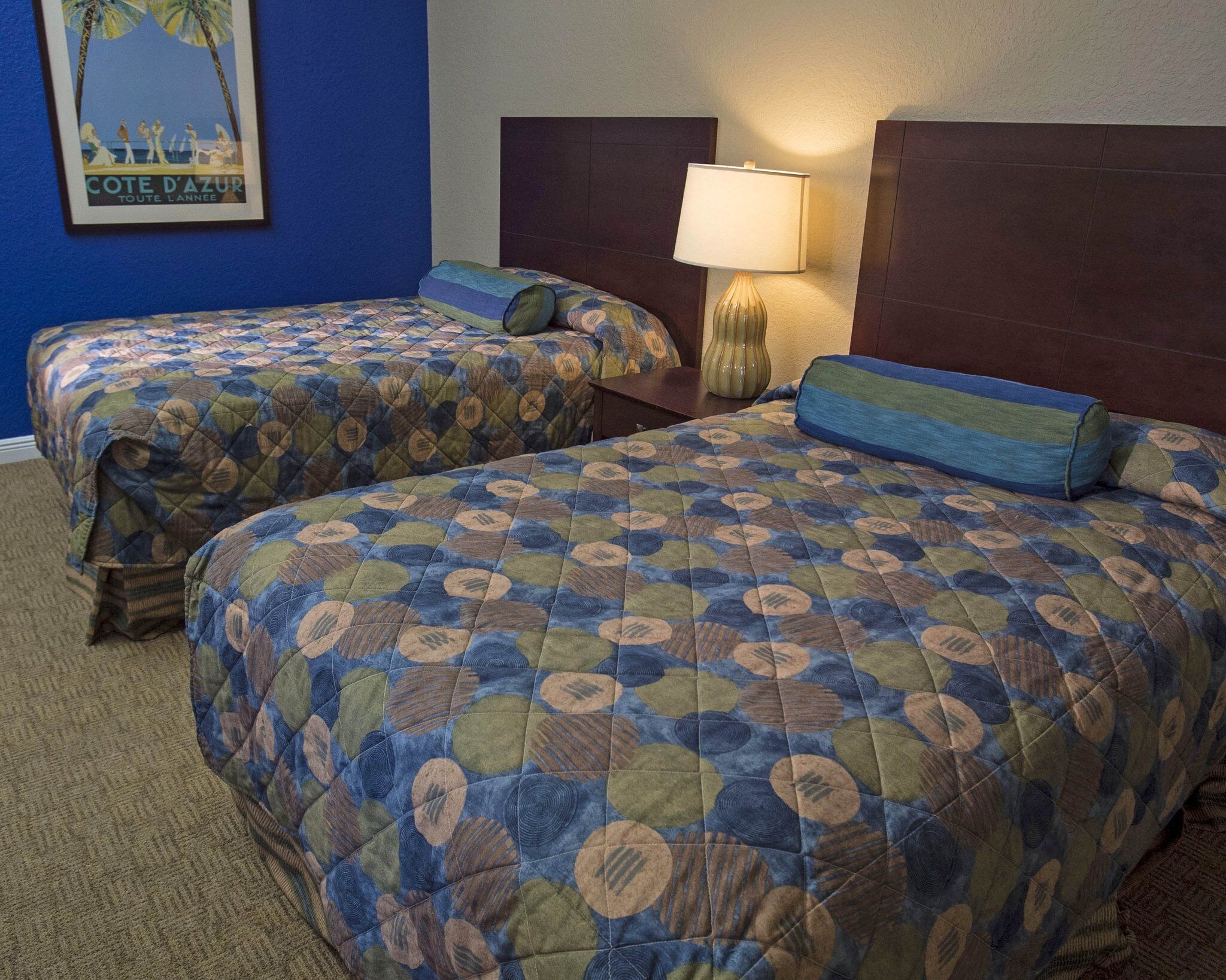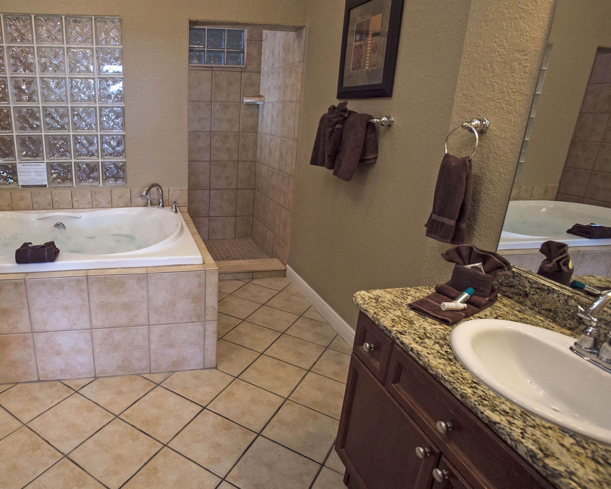 One bedroom timeshare units feature two full baths, with a whirlpool tub and king-size bed in the master bedroom. Two bedroom units offer two-and-a-half baths with the master bedroom having a two-person, color-changing whirlpool tub, and a giant glass block enclosed ultra shower with multi-shower heads. The master bedroom has a king-size bed, and the second bedroom has two queen beds and a private bath. All units at The Gardens resort are equipped with a full kitchen with eat-in bar and granite counter tops, high speed Internet, big screen 46" TV in the living room, 27" TV in each bedroom and an in-villa washer/dryer.