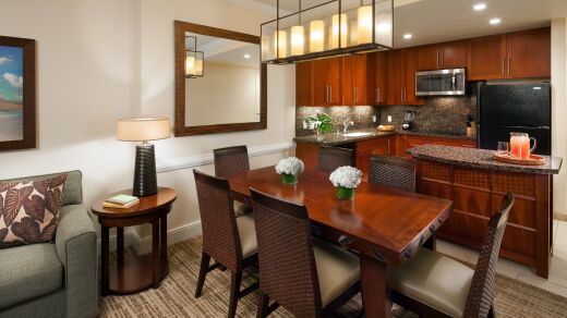 This two-bedroom villa is a combination of a studio and one-bedroom villa that can be separated. The studio side has a king bed, a sleeper sofa, and a partial kitchen. The one-bedroom side has a private bedroom with king bed, a full kitchen and a sleeper sofa in the main living area.