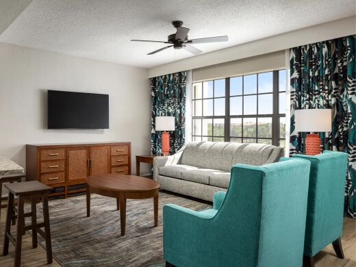 Four villages which make up the Orange Lake Resort property, all of which have their own distinct offerings and charm. East Village is noted for its central location to all the action and also its proximity to world-class golfing, plus a pair of calm and relaxing pools. West Village features a clubhouse overlooking the lake, a themed restaurant with patio bar, putt-putt golf, arcade, cabanas and retail shops. River Island is a tropical lover's paradise, centered around a fabulous water park that includes two beach-style pools and a lazy river. North Village is a water lover's delight and offers a smaller, more intimate setting for family fun.