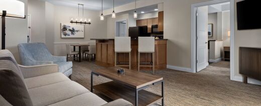 A one-bedroom Deluxe Suite with a king bed in the bedroom, sofa bed in the living area, and a full kitchen.