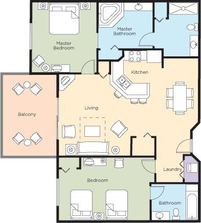 A three-bedroom Deluxe Suite that includes two king beds, two full beds in the third bedroom, and a queen sofa bed, as well as a full kitchen.